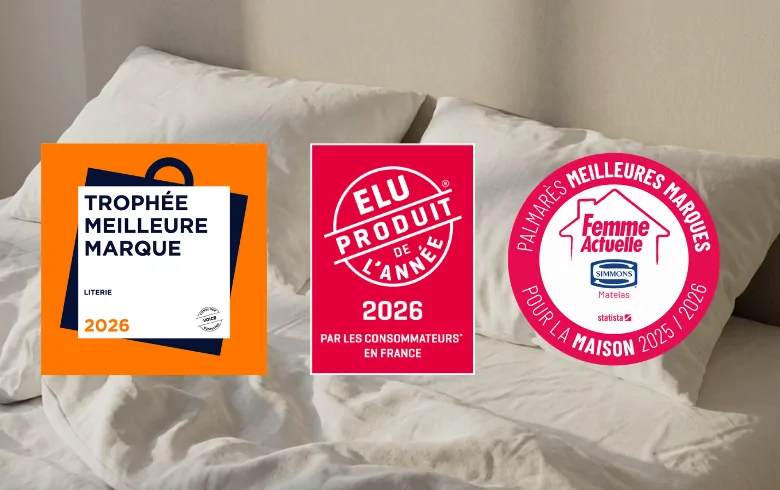 Cette année, Simmons se distingue par ses récompenses prestigieuses : titulaire du Trophée Meilleure Marque Literie, élue au Palmarès Meilleures Marques Maison Femme Actuelle et reconnue pour sa collection Hybride Fraicheur, Élue Produit de l’Année. Ces distinctions confirment notre savoir-faire et notre engagement pour un sommeil d’exception.