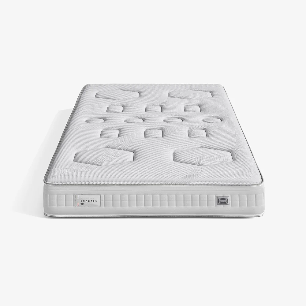 - Conception hybride spécifique (ressorts ensachés, mousse de confort, mousse haute résilience) : le matelas Boréale est spécialement conçu pour offrir un soutien adapté aux personnes en recherche de soutien ferme et accueil enveloppant.